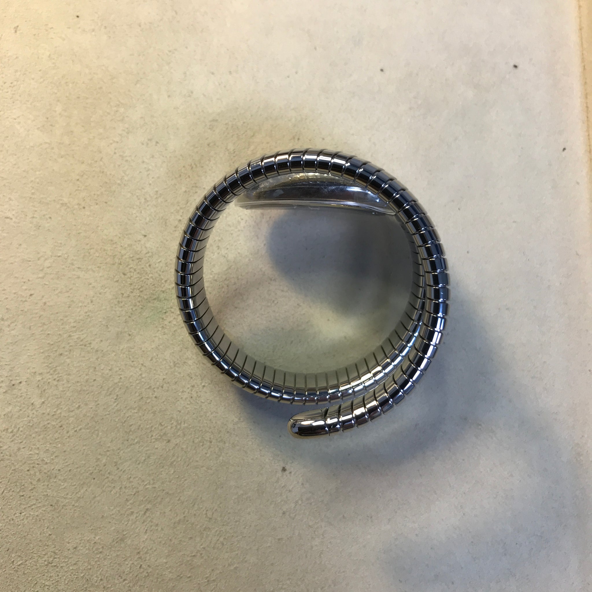 Merging two of the most iconic symbols of Bulgari design, the Serpenti Tubogas watch coils the sinuosity of the snake with the contemporary soul of tubogas. Evoking both the sensual curves of a woman and the fluid shape of the serpent, the timepiece is crafted with the shapely lines of this specific technique, with a flexible and tubular litheness. Radiating glamour and a truly individual style, this watch marks a distinctive chapter in the constant evolution of Serpenti. Serpenti Tubogas watch with quartz movement, 35 mm stainless steel curved case, stainless steel crown set with a cabochon cut pink rubellite, silver opaline dial with guilloché soleil treatment and hand-applied indexes, single spiral stainless steel bracelet.