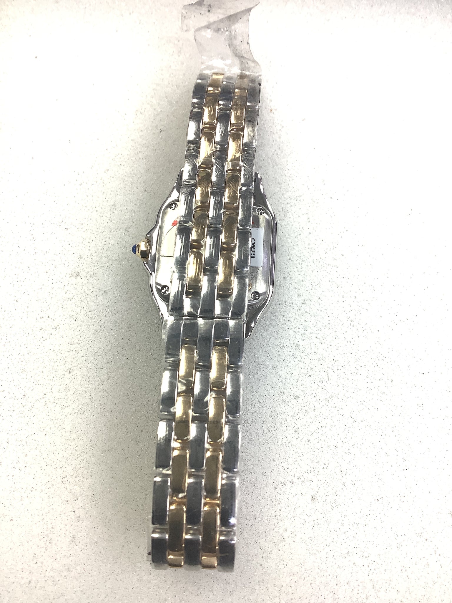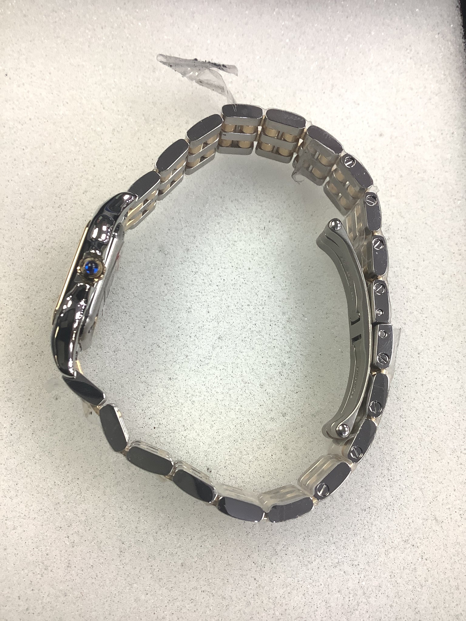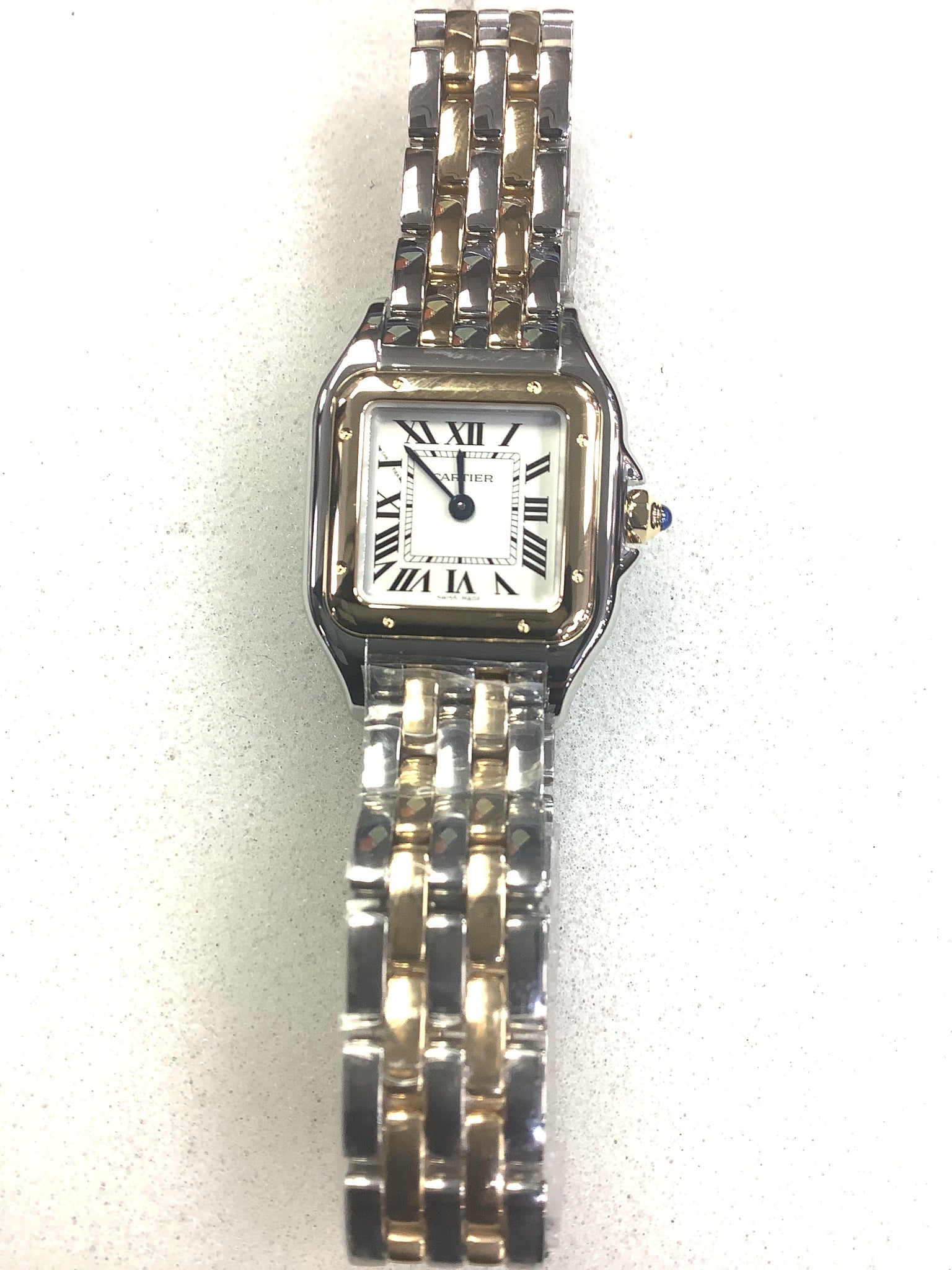 Panthère de Cartier watch, small model, quartz movement. Case in yellow gold 750/1000 and steel, dimensions: 23 mm x 30 mm, thickness: 6 mm, crown set with a synthetic blue spinel, silvered dial, blued-steel sword-shaped hands, bracelet in yellow gold 750/1000 and steel. Water-resistant to 3 bar (approx. 30 meters).