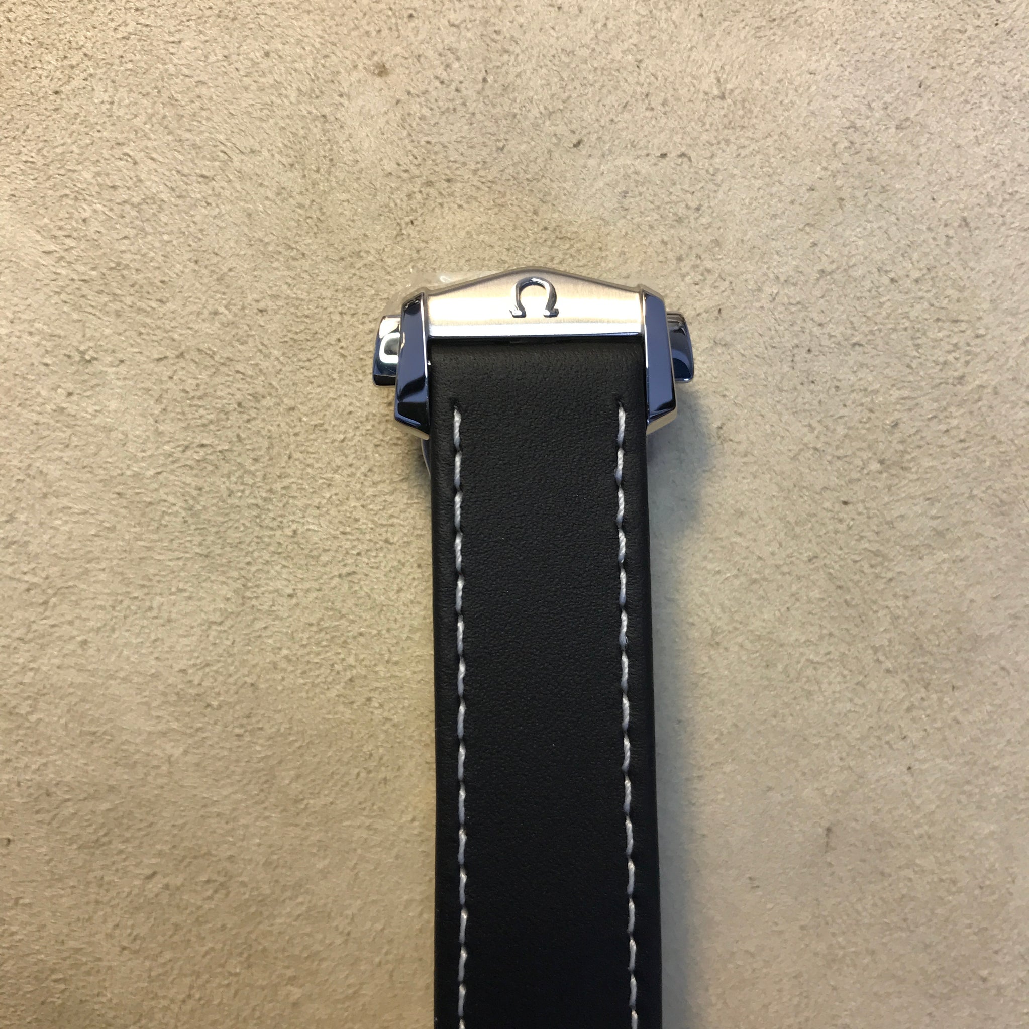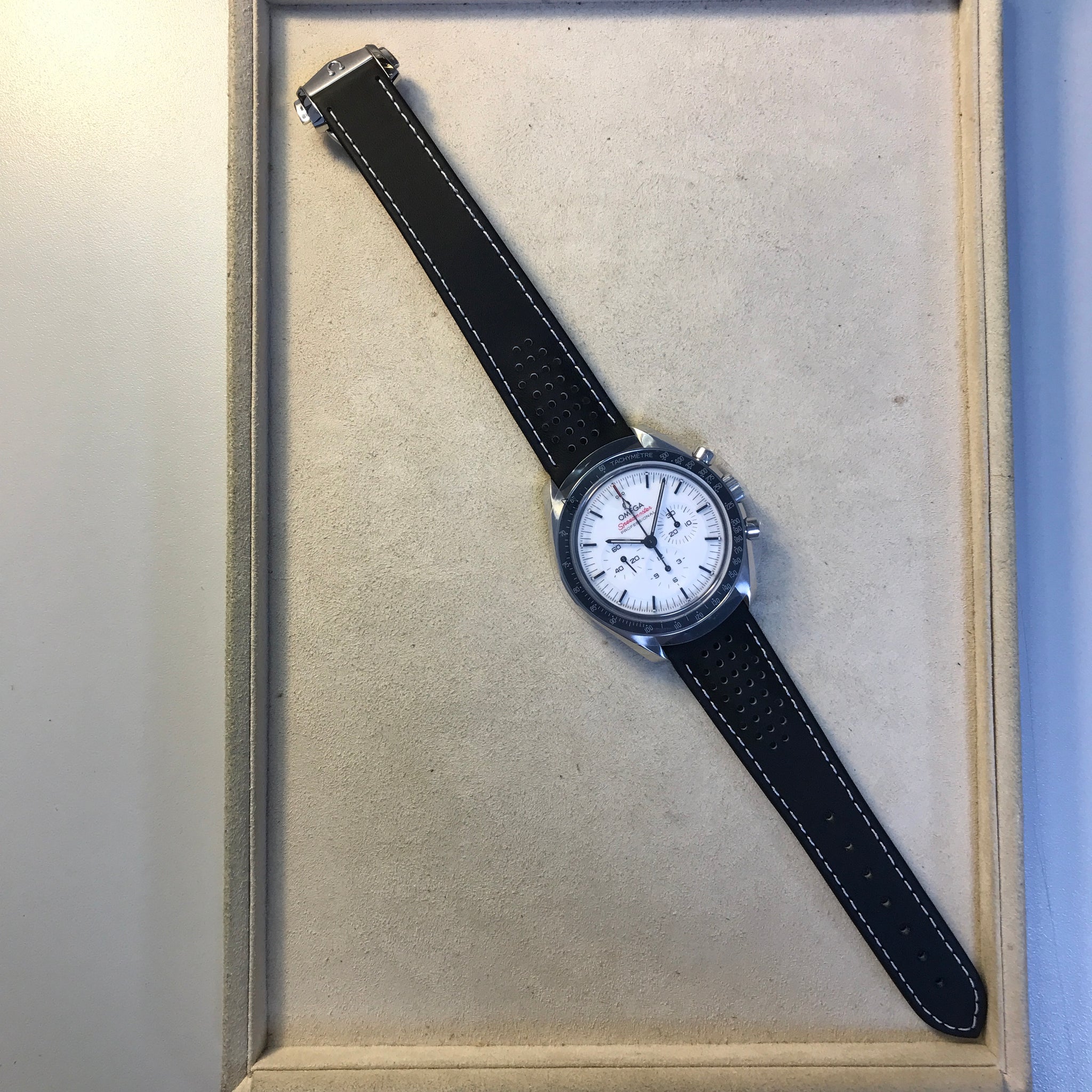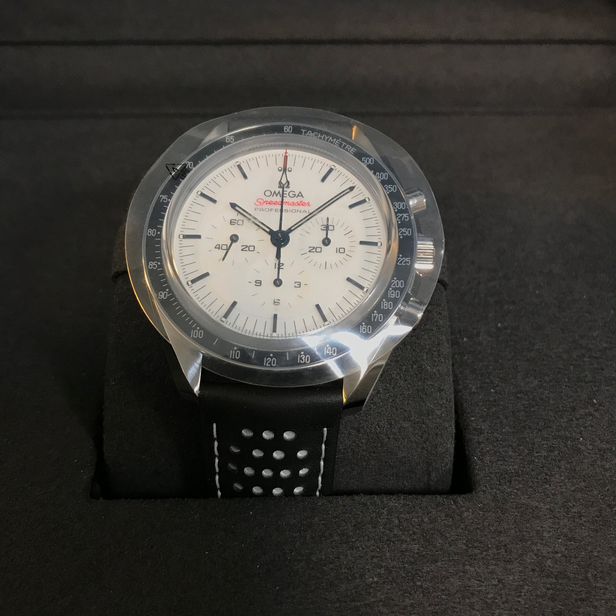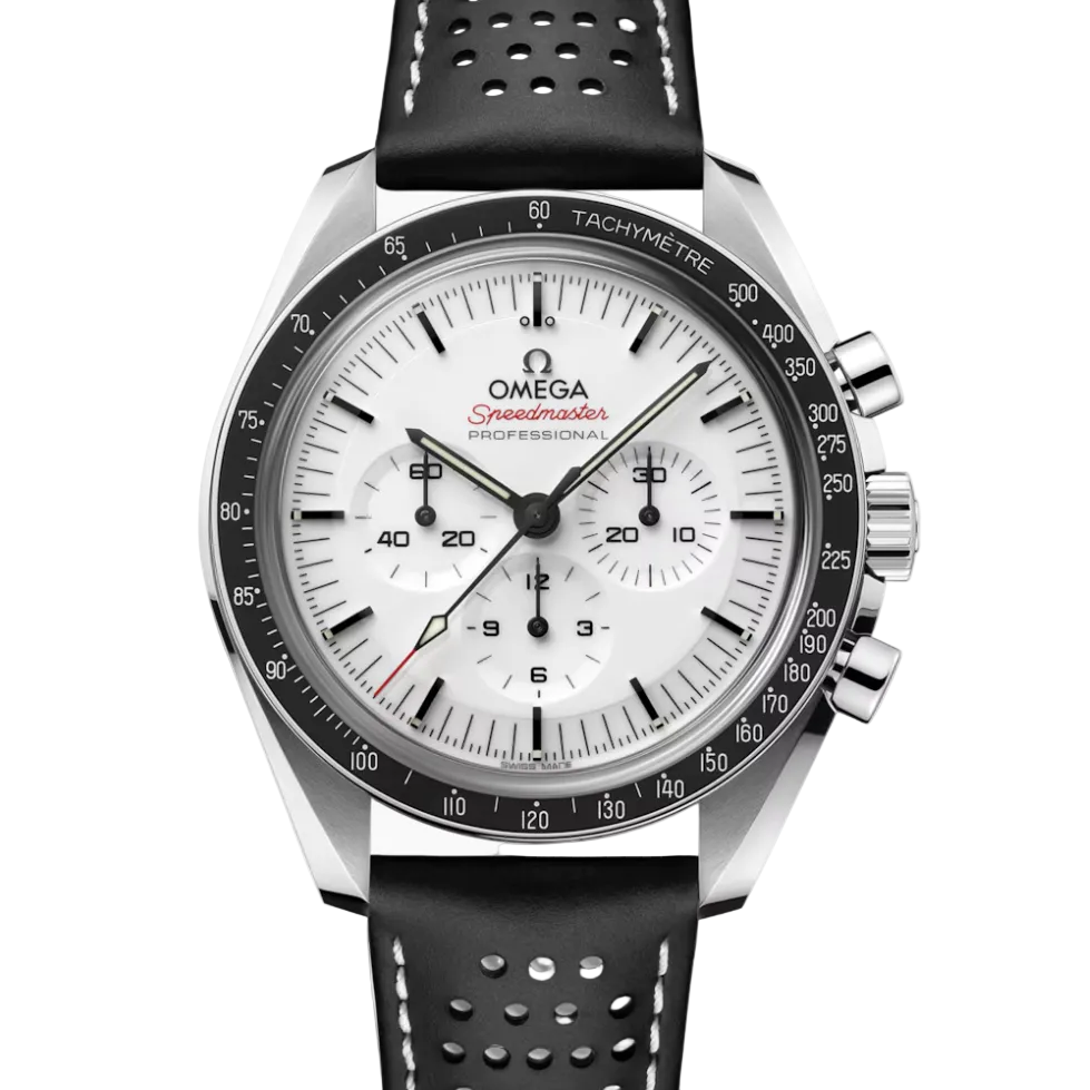 Presented on a black micro-perforated leather strap with red and white stitching, this 42 mm Moonwatch in stainless steel features sapphire crystal glass on the front as well as on the caseback. Inspired by the 4th generation Speedmaster style worn on the moon, it also includes an asymmetrical case, a white lacquered step dial with applied OMEGA logo and indexes, Moonwatch style hands, and the famous dot over 90 on the black anodised aluminium bezel ring.