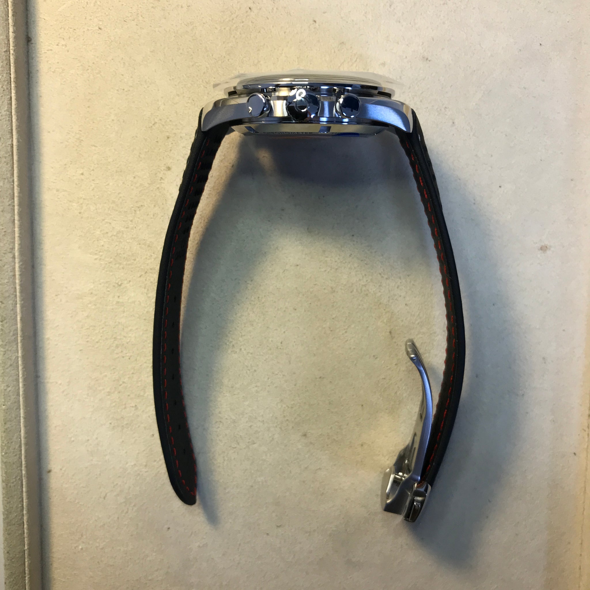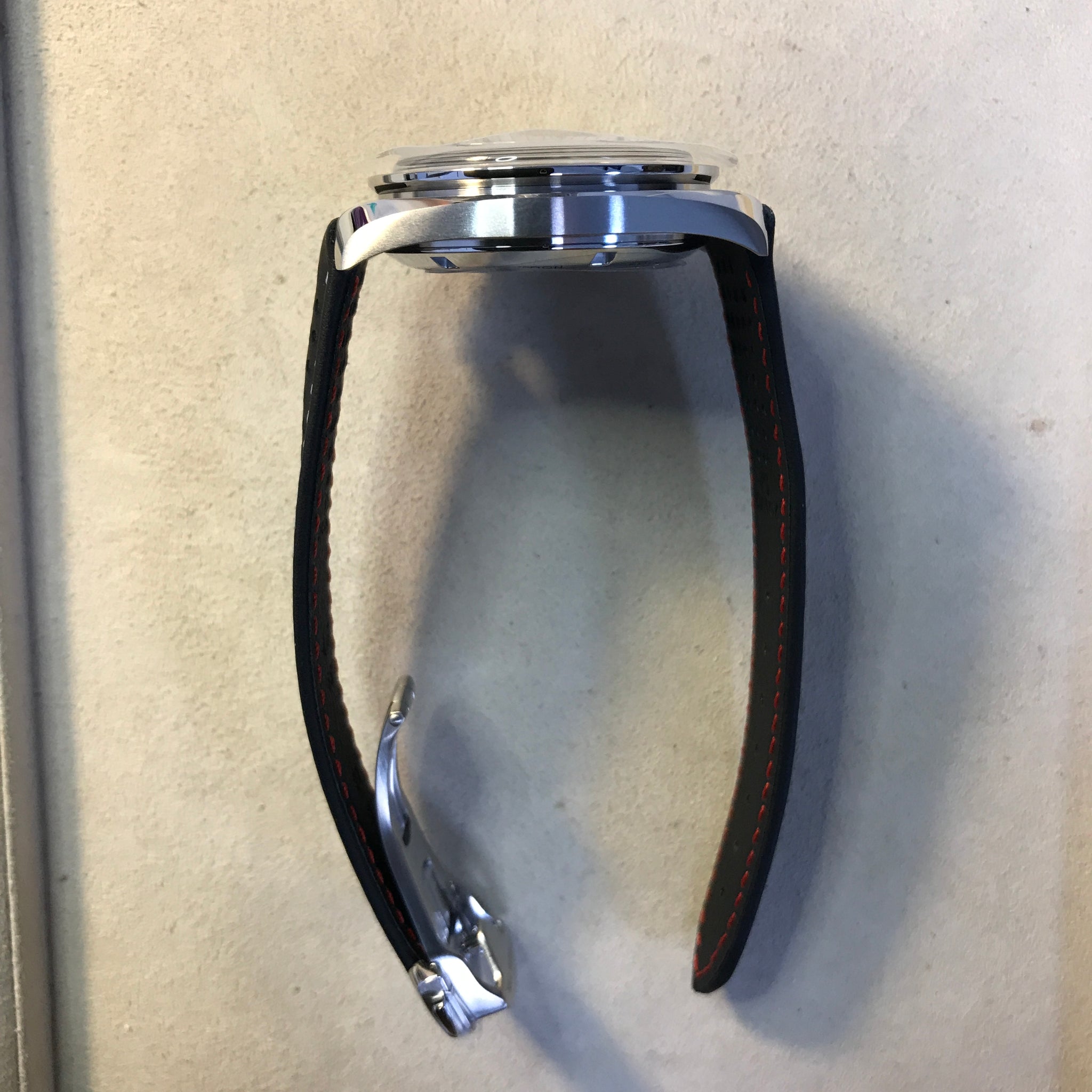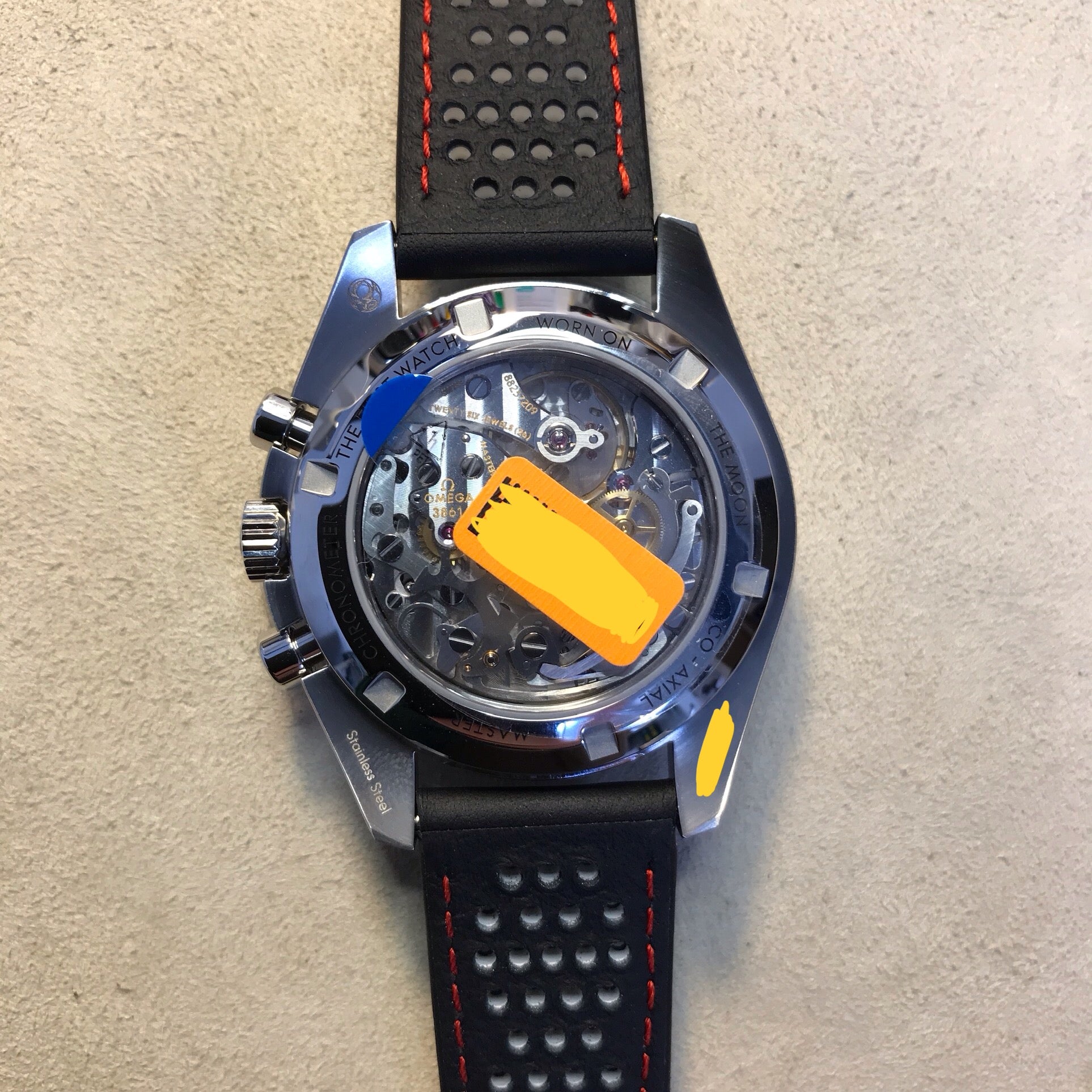 Presented on a black micro-perforated leather strap with red and white stitching, this 42 mm Moonwatch in stainless steel features sapphire crystal glass on the front as well as on the caseback. Inspired by the 4th generation Speedmaster style worn on the moon, it also includes an asymmetrical case, a white lacquered step dial with applied OMEGA logo and indexes, Moonwatch style hands, and the famous dot over 90 on the black anodised aluminium bezel ring.