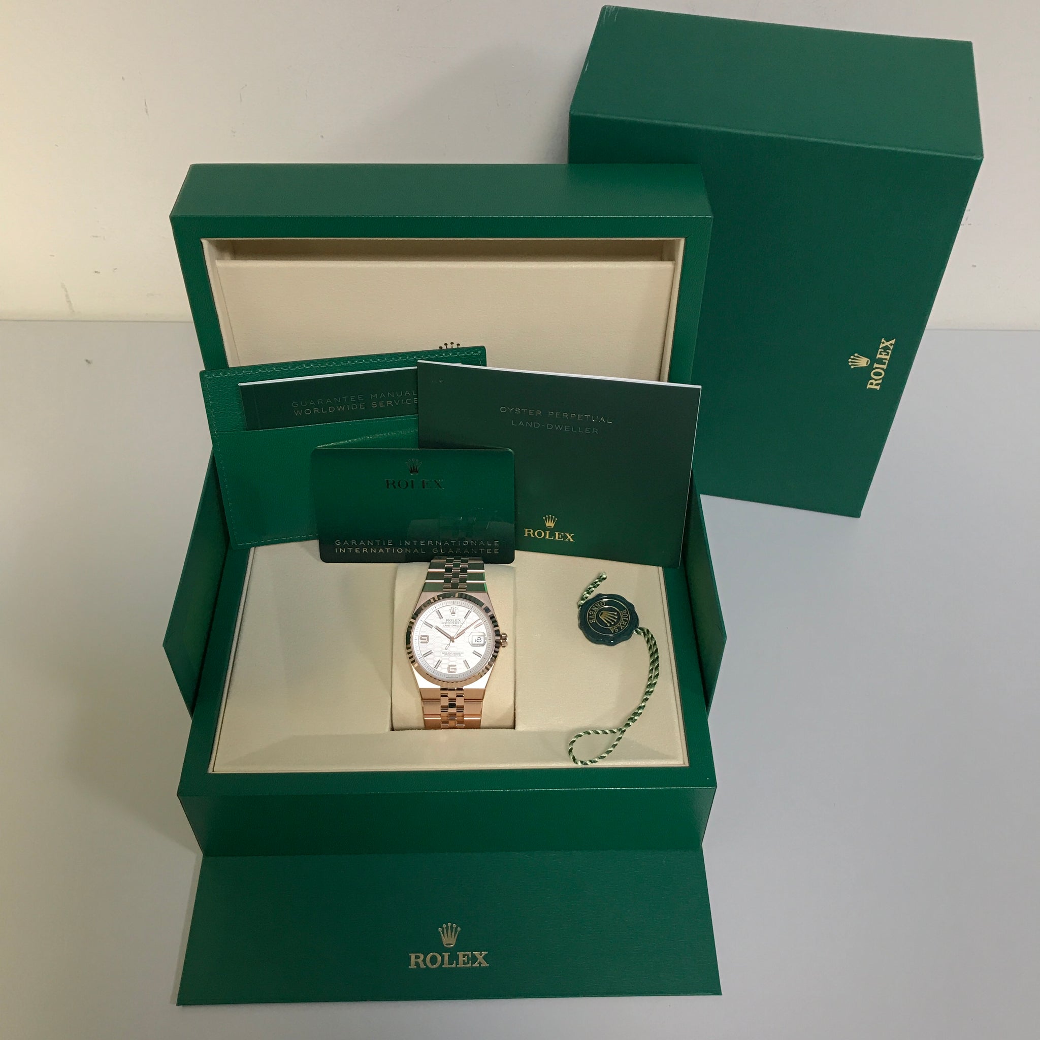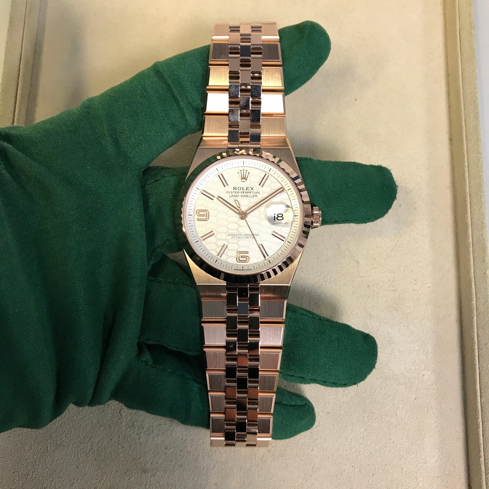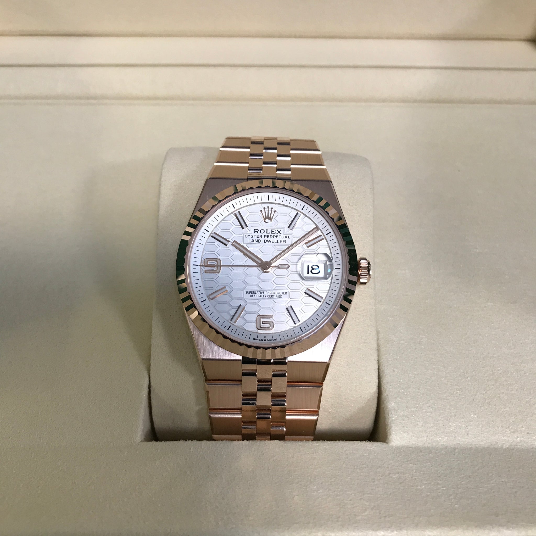 Its white honeycomb dial features champlevé rose-gold numerals and Chromalight hands, while the Twin-lock crown seals 100 m of water-resistance around the 70-hour Calibre 7135. Bold yet wearable, it’s the ultimate warm-metal Land-Dweller.