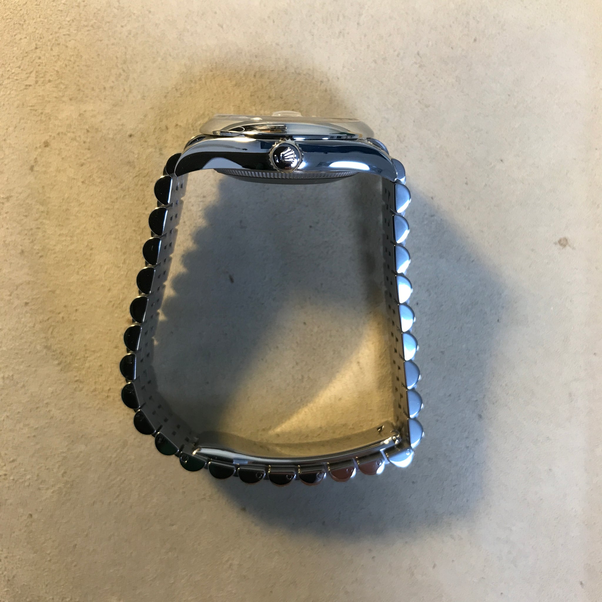 31mm Oystersteel case, screw-down back, screw-down crown with twinlock double waterproofness system, domed bezel, scratch-resistant sapphire crystal with cyclops lens over the date, silver dial, index hour markers, Rolex calibre 2236 perpetual self-winding movement with date at 3 o'clock, approximately 55 hours of power reserve, Oystersteel Jubilee bracelet with five-piece links, concealed folding Crownclasp buckle. Waterproof to 100 meters.