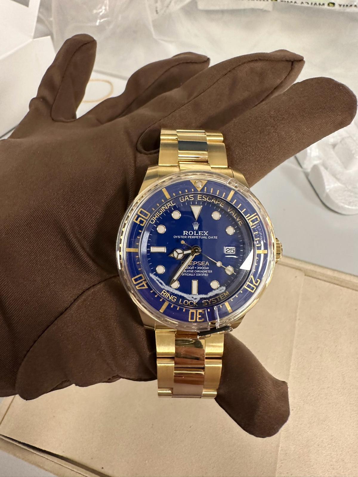 Rolex introduces the all-gold Deepsea Ref. 136668LB, a luxurious addition to their esteemed diver's watch lineup. This remarkable timepiece combines a stunning blue lacquer dial with an 18k yellow gold case and bracelet, exuding opulence while retaining the technical prowess of the Deepsea Sea-Dweller series. At 44 mm in diameter and 17.7 mm thick, the watch features a helium escape valve and RLX titanium caseback for exceptional pressure resistance. Powered by the reliable Cal. 3235 movement, it offers a 70-hour power reserve and is water-resistant up to 3,900 meters. The vibrant blue Chromalight luminescence ensures readability in low light. The Deepsea Ref. 136668LB is a statement of luxury and engineering excellence, catering to those who seek both elegance and performance in a diving watch.