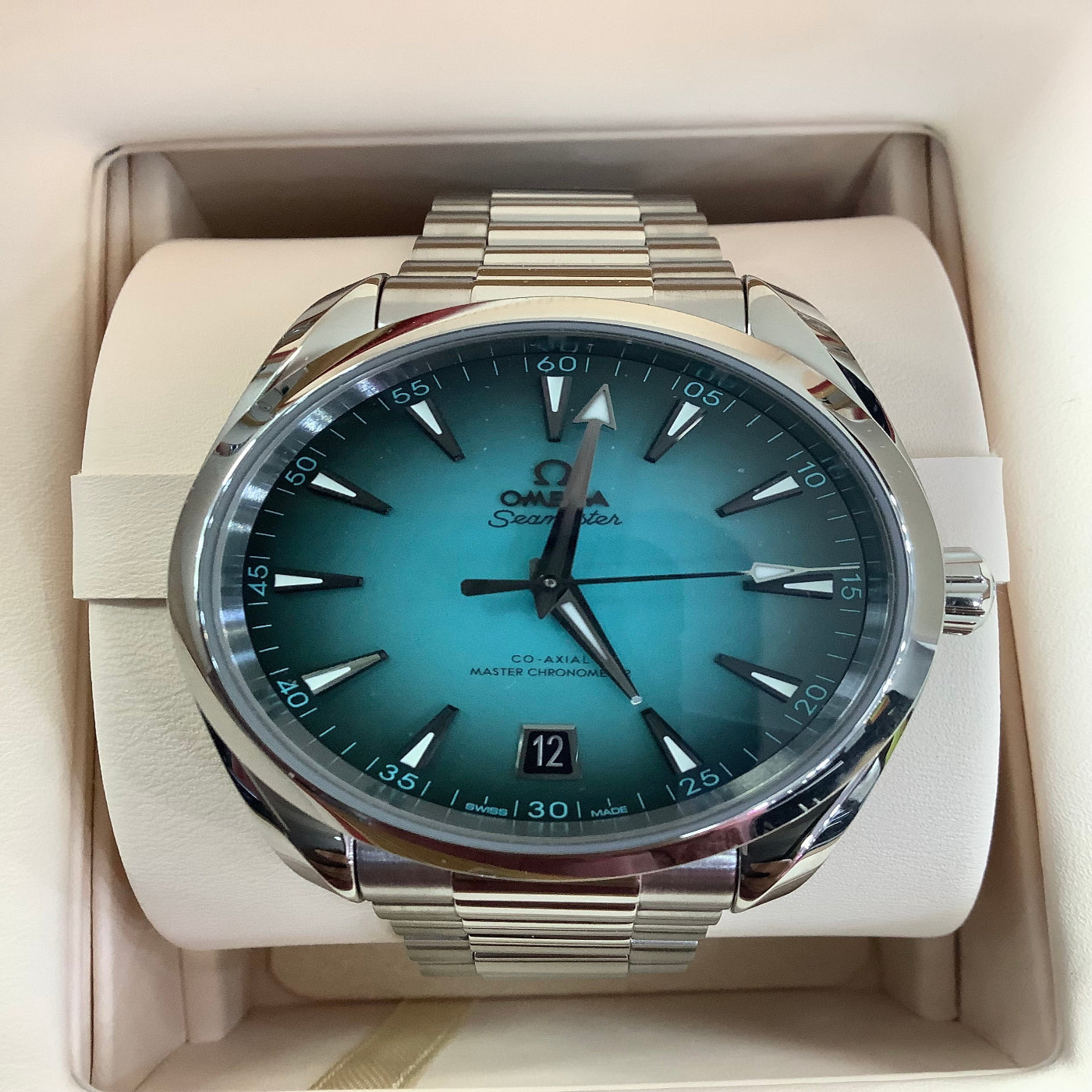 The lacquered turquoise dial is accentuated with a black gradient effect and features facetted hands and hour markers with a grey PVD treatment and white Super-Luminova. The OMEGA logo and date window are also grey PVD treated, matching the transferred wordings in grey and turquoise.