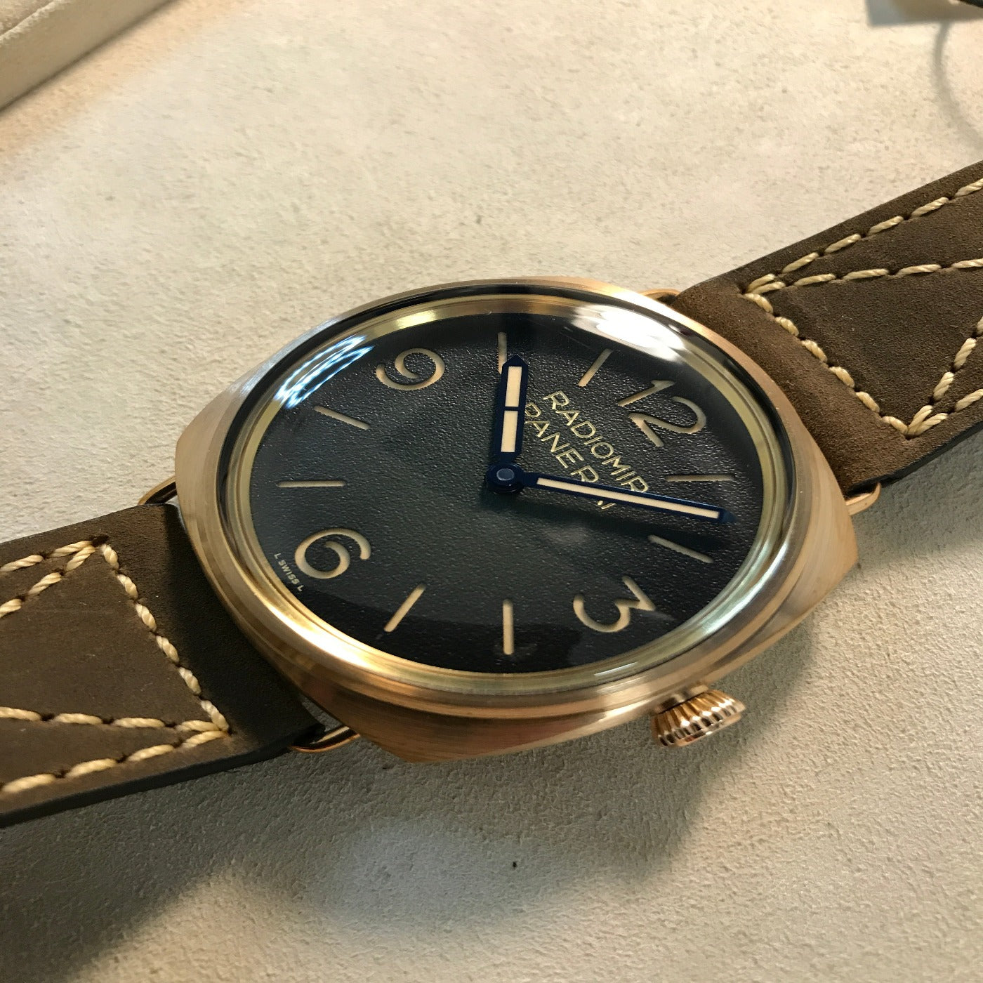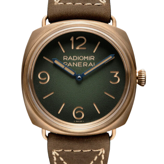 The Panerai Radiomir 3 Days PAM PAM00760 was introduced in 2022. This watch has a bronze case and a green dial, 47mm brushed bronze case, sapphire crystal back, brushed bronze bezel, shaded green dial with luminous arabic numerals and hour markers, P.3000 calibre hand-wound movement with hours, minutes, approximately 3 days of power reserve, vintage calf strap with beige stitching. Water resistant to 10 bar (~100 metres).