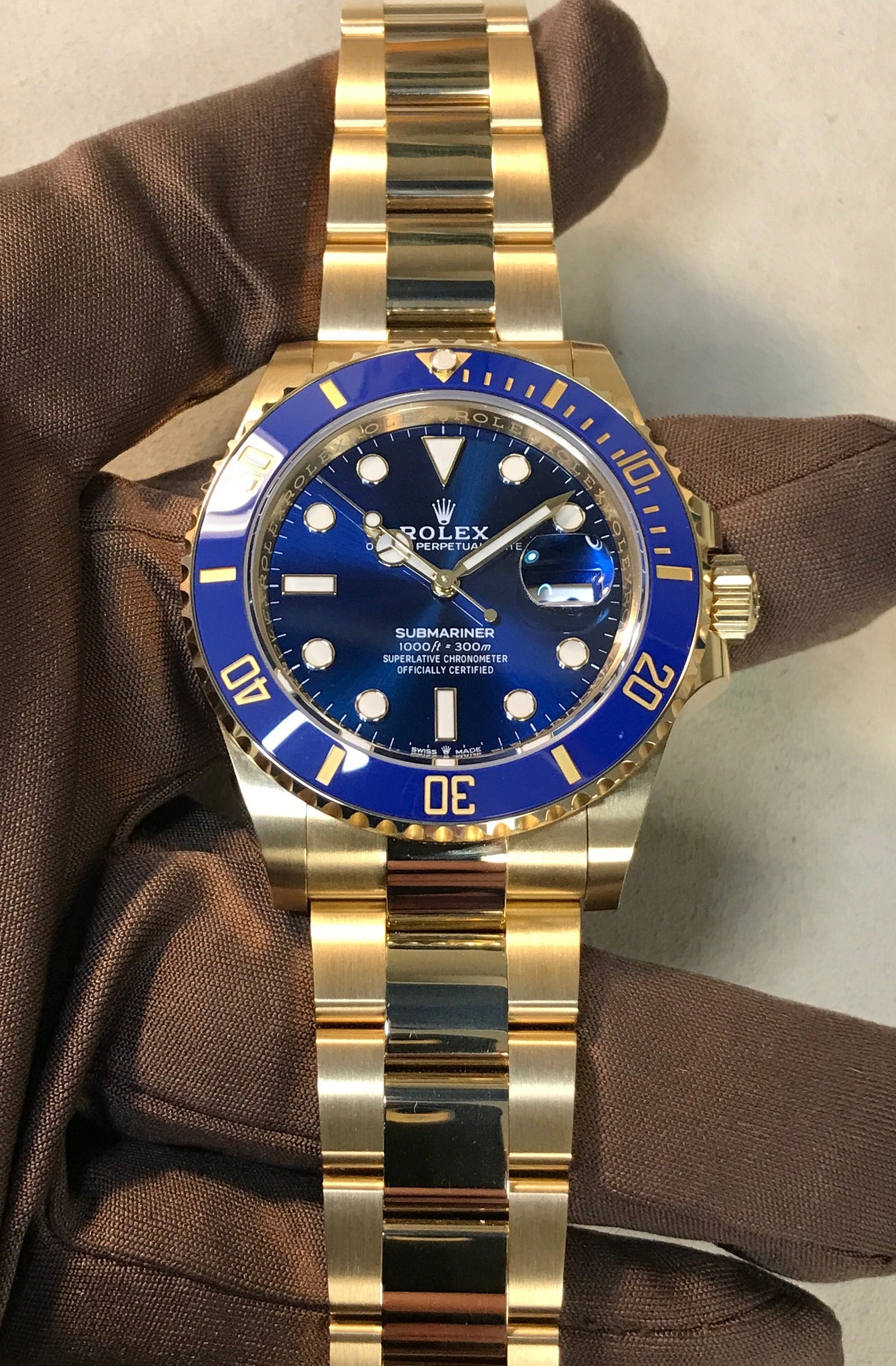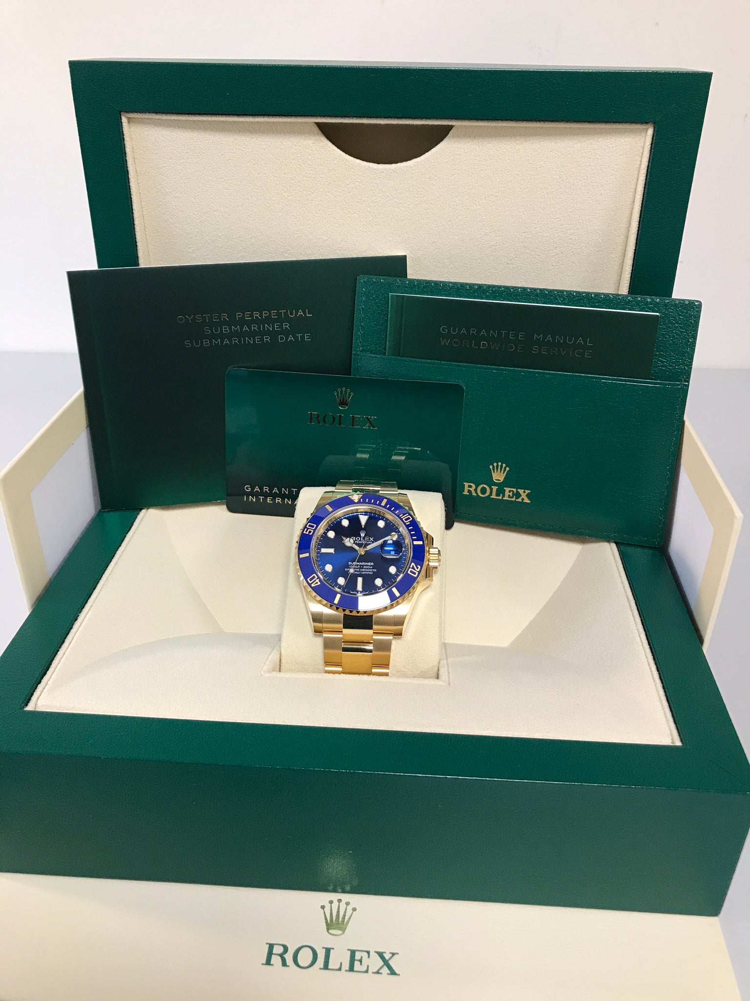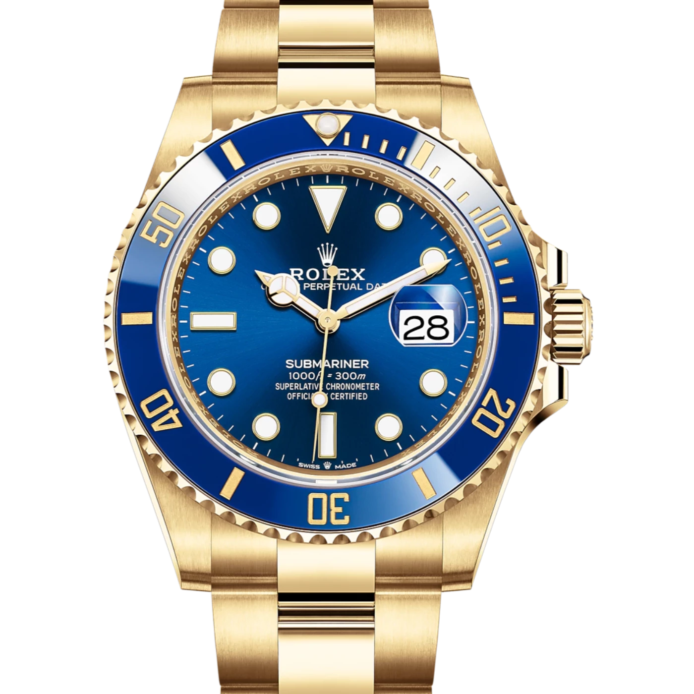 Setting the standard high for all divers' watches--- The Rolex Submariner Date exemplifies the historic links between the world of Rolex and diving. Designed with a 41mm stainless steel case with oyster architecture that features a monobloc middle case, a sapphire crystal and a screw-down case back winding crown. The blue ceramic bezel rotates unidirectionally and features numerals and raised graduations coated in platinum. The stunningly rich blue dial features date display and luminescent hour markers and hands which makes it legible underwater and dark environments. It is powered by the self-winding automatic 3235 Calibre movement, which has date functionality and a power reserve of 70 hours. The case housed on an Oyster bracelet with Oysterlock clasp. This timepiece includes a water resistance up to 300 meters, making it the perfect timepiece for deep-sea explorers.