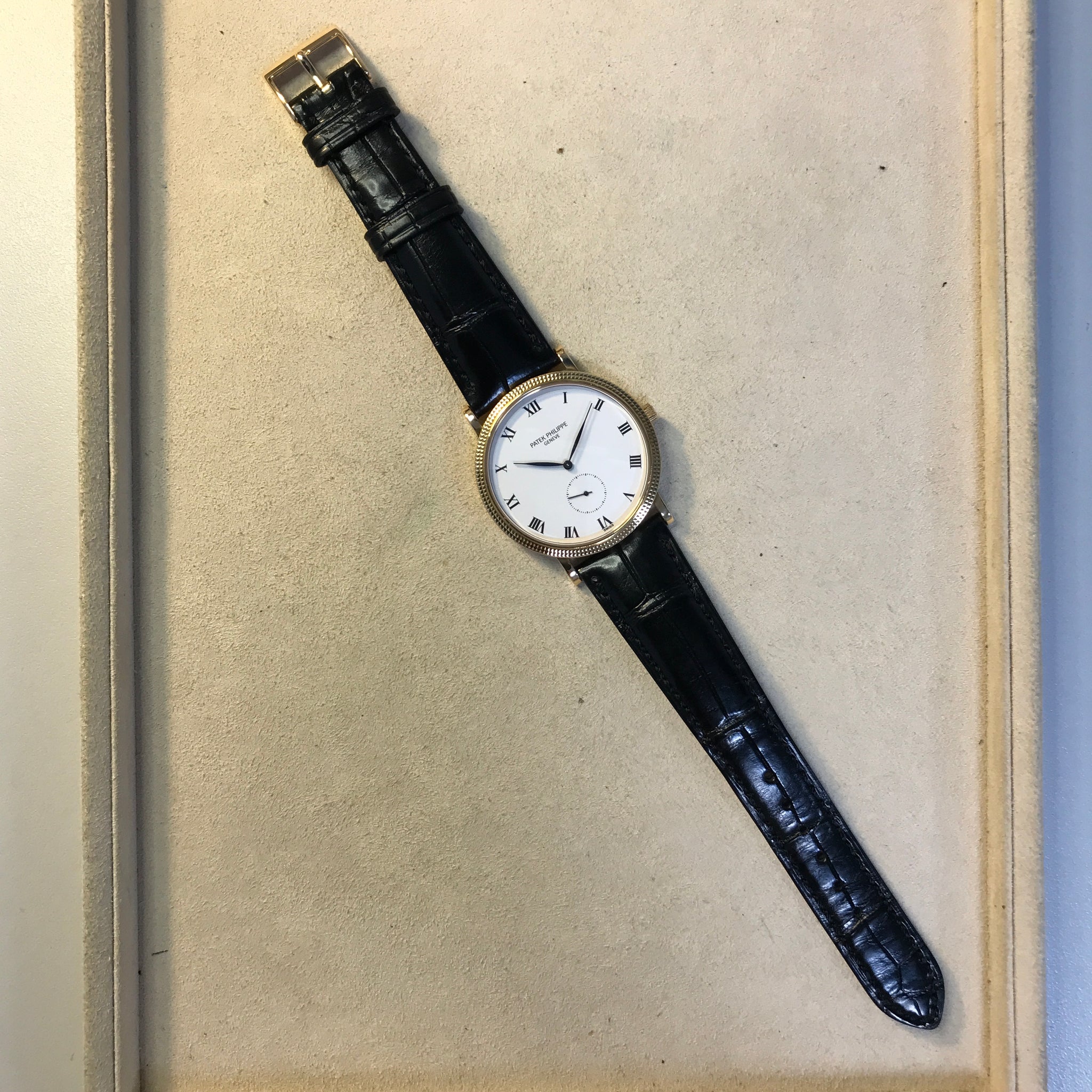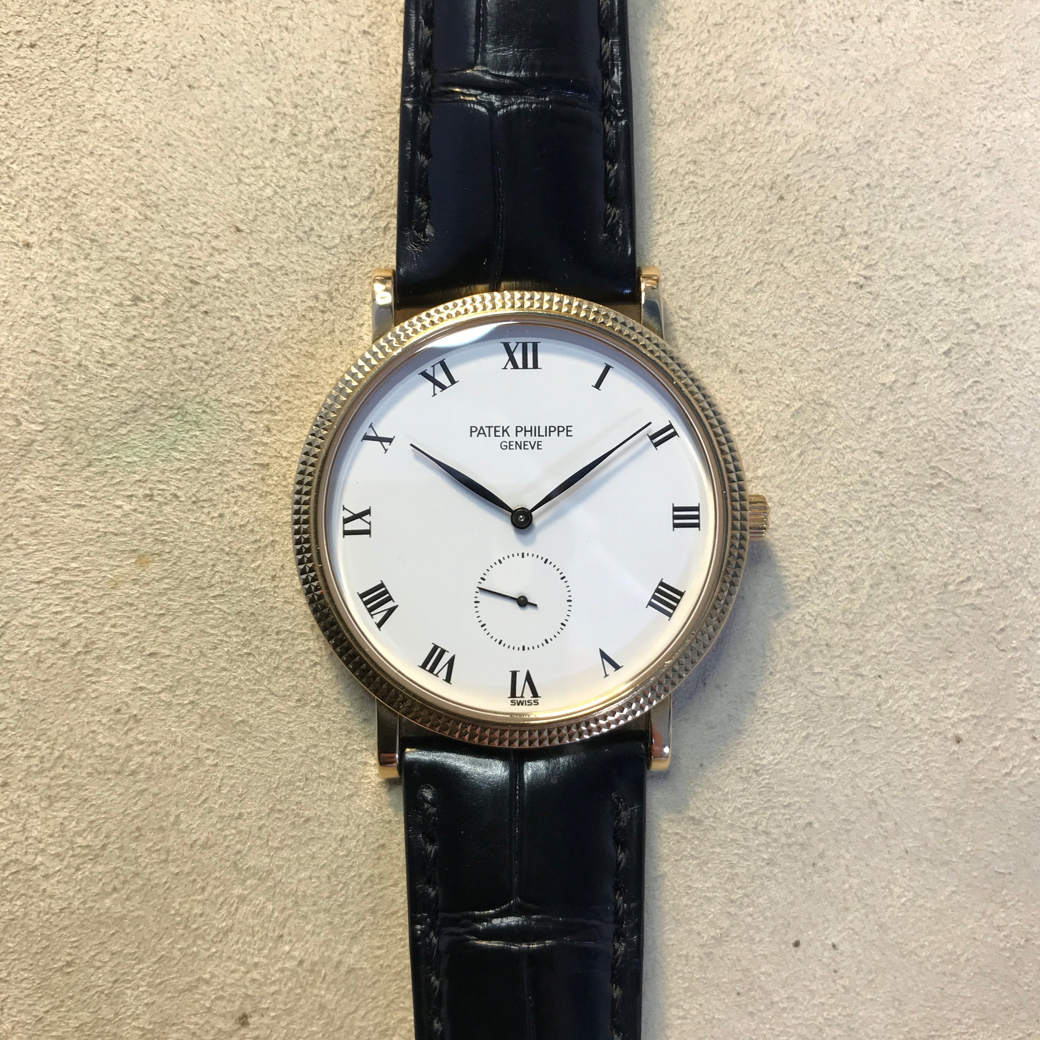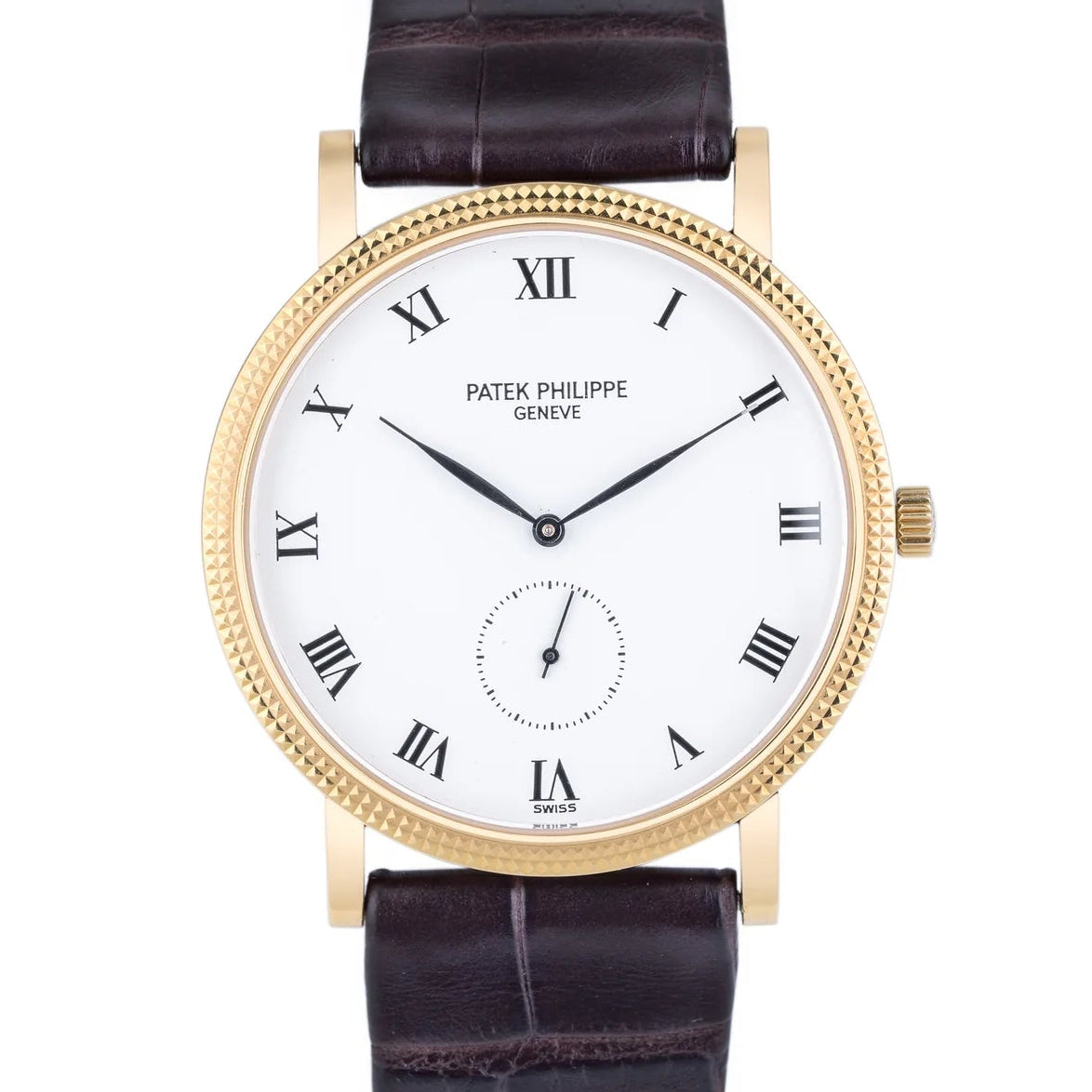 Patek Philippe Calatrava 3919J Mens Watch. 34mm 18K yellow gold case with 18K yellow gold hobnail patterned bezel. White dial with black hands and Roman numeral hour marker. Small second sub-dial display between 5 & 7 o'clock position. Black Patek leather strap with 18K yellow gold buckle. Will fit up to 7-inch wrist. Sapphire crystal. 18K yellow gold case back. Mechanical hand winding movement up to 48 hours power reserve.