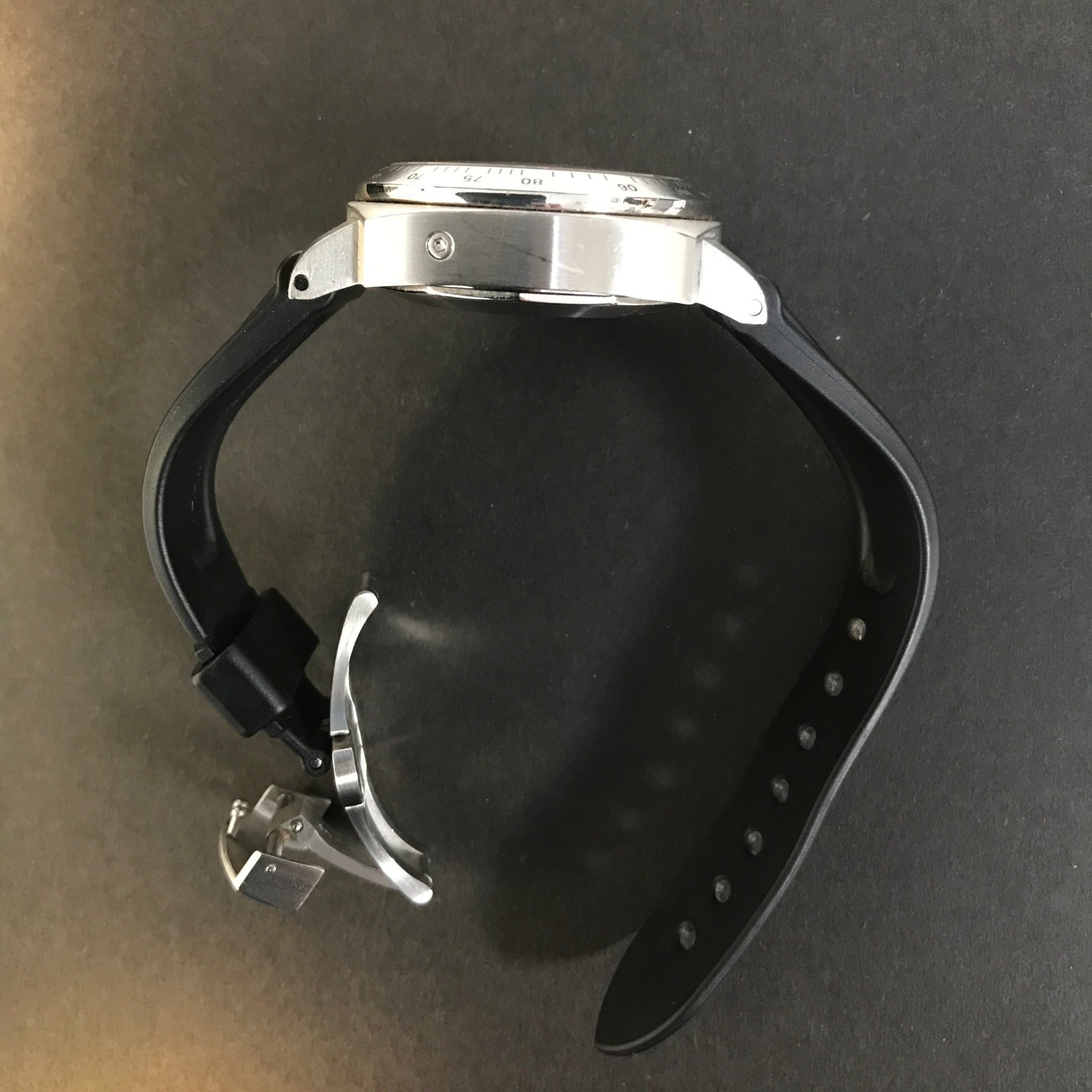 This reference the PAM00250 was produced for just 2 years and succeeded the PAM196. It was set in the classic Luminor 44mm stainless steel cushion-shaped case with an engrave tacymetre steel bezel. The black dial features luminous hour markers and hands, date aperture between 4/5 o’clock and triple sub-dials for measuring up to 12 hours. The crown is Panerai’s patented design and is flanked, seamlessly with the two chronograph pushers and is water resistant up to 100m. Powered by the Panerai calibre OP XII automatic movement and fitted on a black alligator strap with a steel folding deployment buckle.